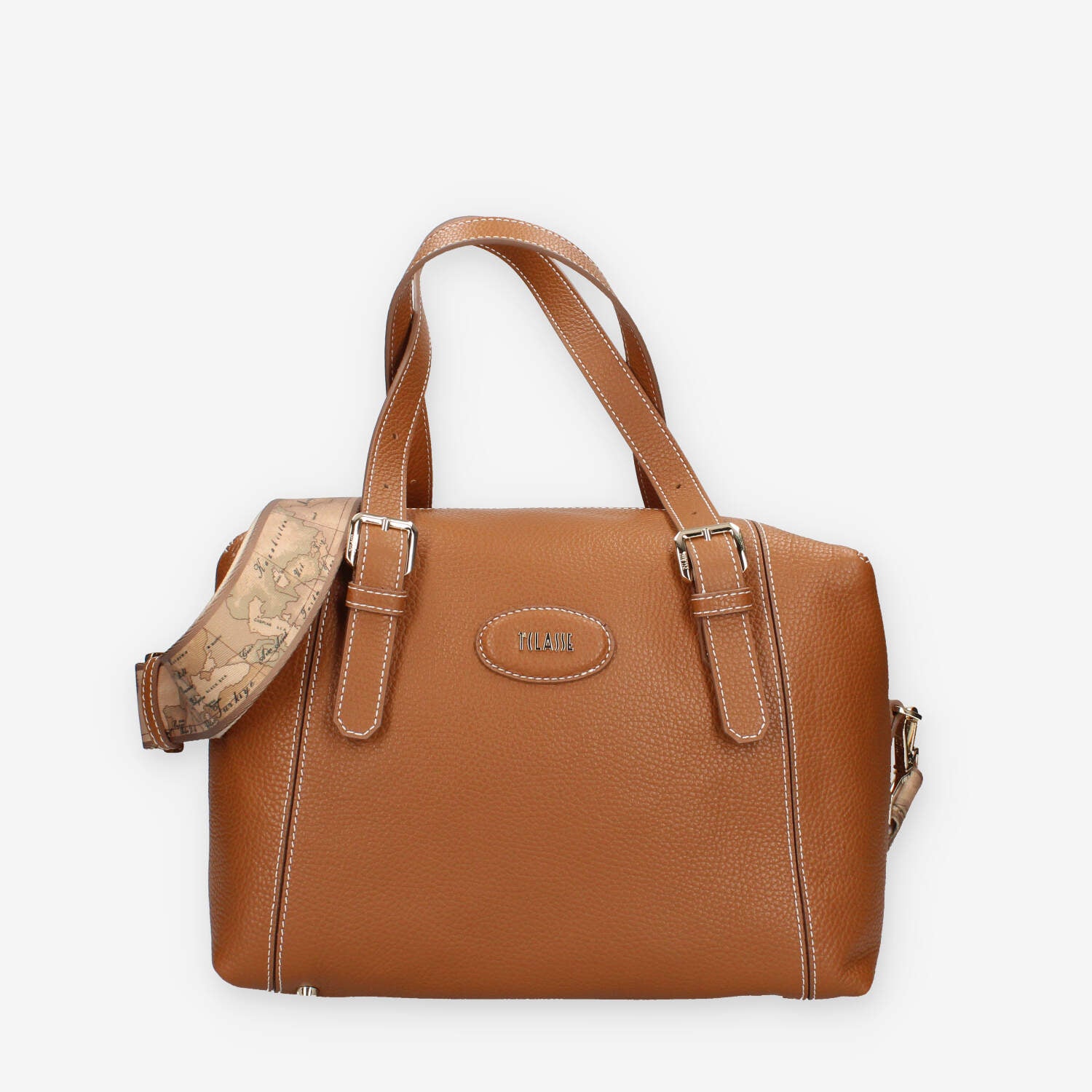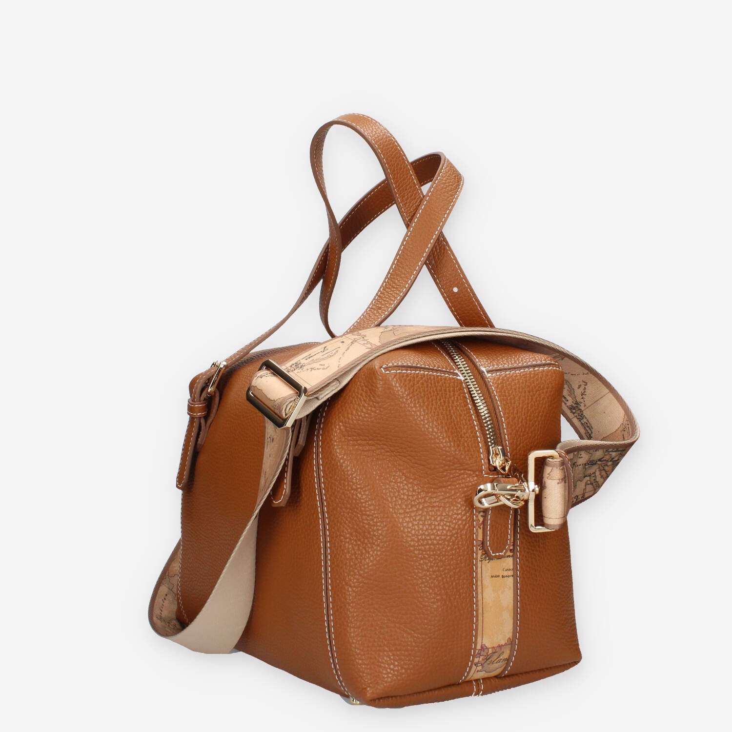 Bauletto in vera pelle tabacco con dettagli in tessuto stampa Geo Classic, dotato di 3 tasche interne di cui 1 con zip, chiusura lampo, 2 manici e tracolla regolabili.