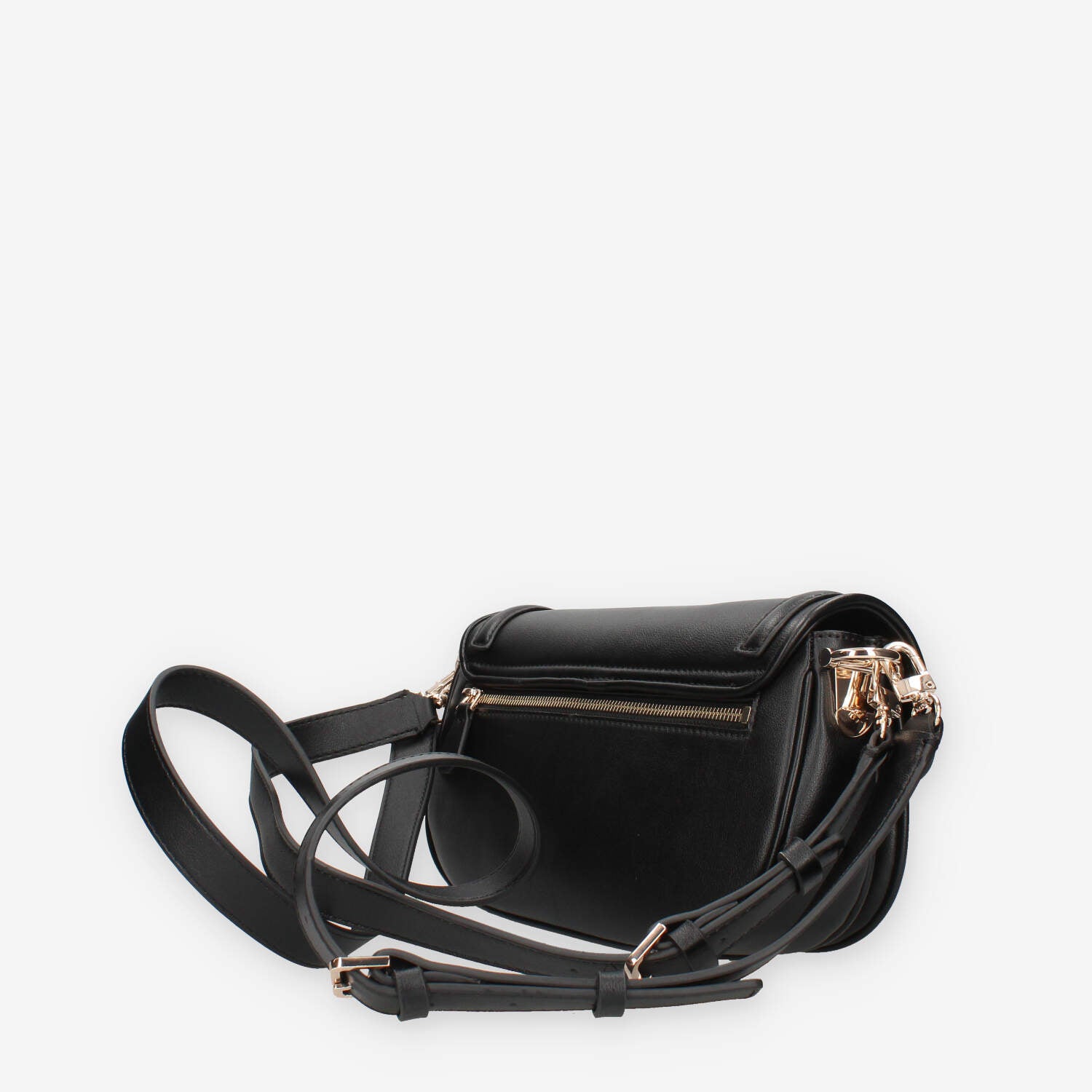 Borsa a tracolla nera a 2 scomparti dotata di patta di chiusura con bottoni magnetici, 1 tasca interna, 1 esterna, 6 fessure per carte di credito, manico e tracolla regolabile ed opzionabile.