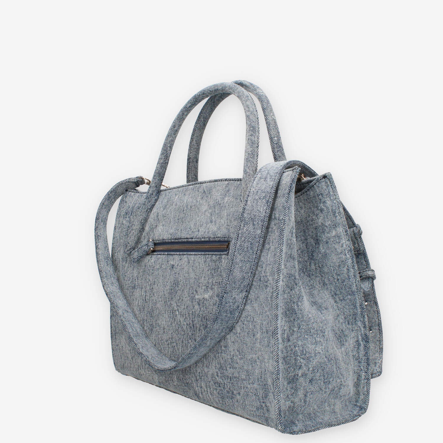 Borsa a mano in tessuto denim dotata di lampo di chiusura centrale, 3 tasche interne e 1 esterna e tracolla opzionabile e regolabile.