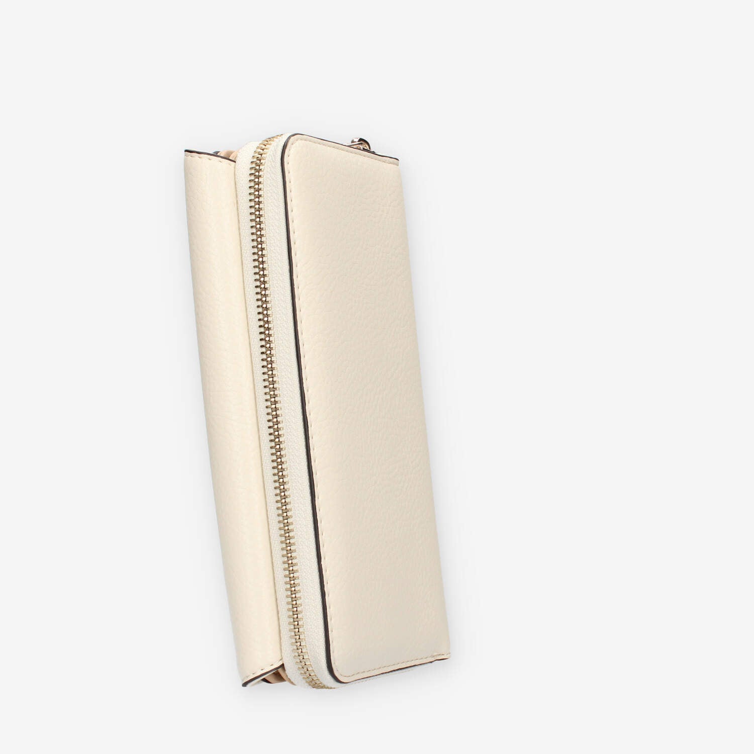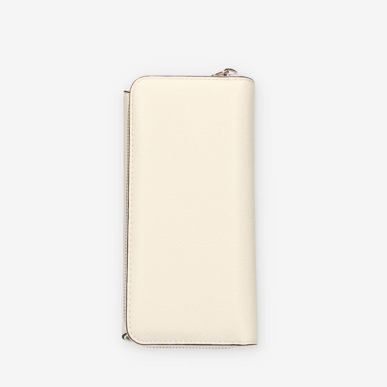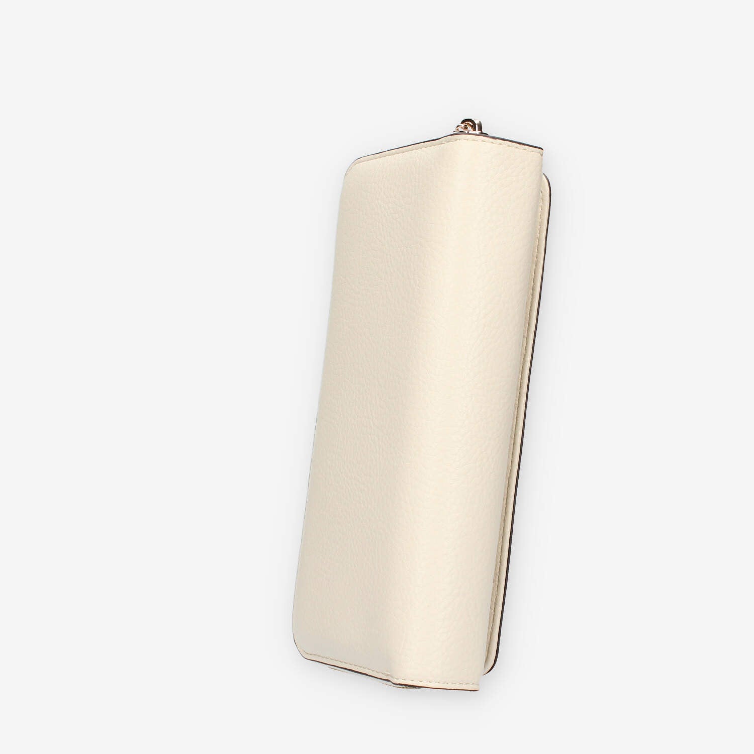 Portafogli avorio da donna in ecopelle dotato di 3 sezioni per banconote, 26 fessure per carte di credito, 2 scomparti per ricevute, 1 tasca per monete, lampo e patta di chiusura con bottncini automatici.