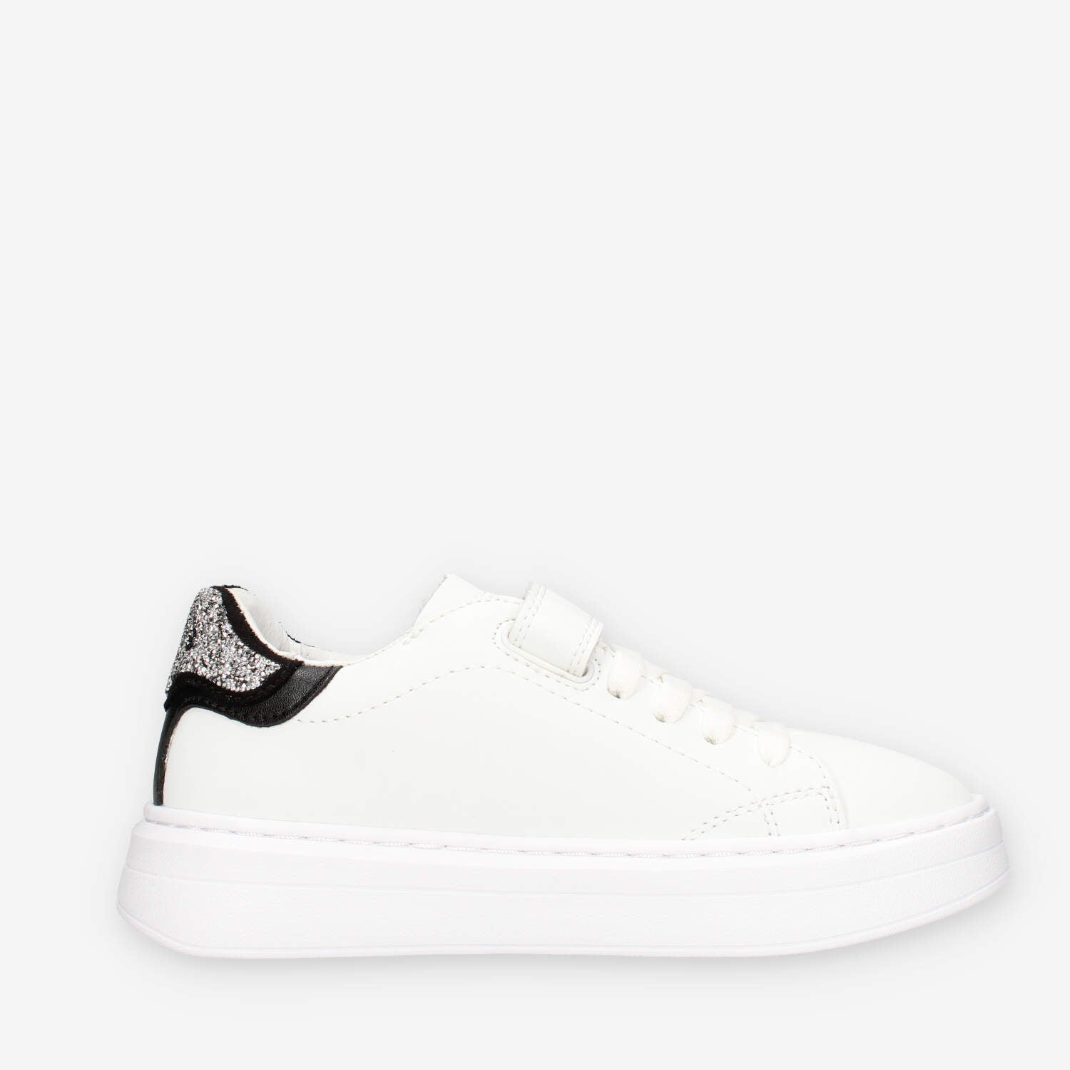 Sneakers bianche da bimba in ecopelle dotate di lacci elastici e chiusura a strappo, sottopiede in tessuto estraibile e fondo in gomma.