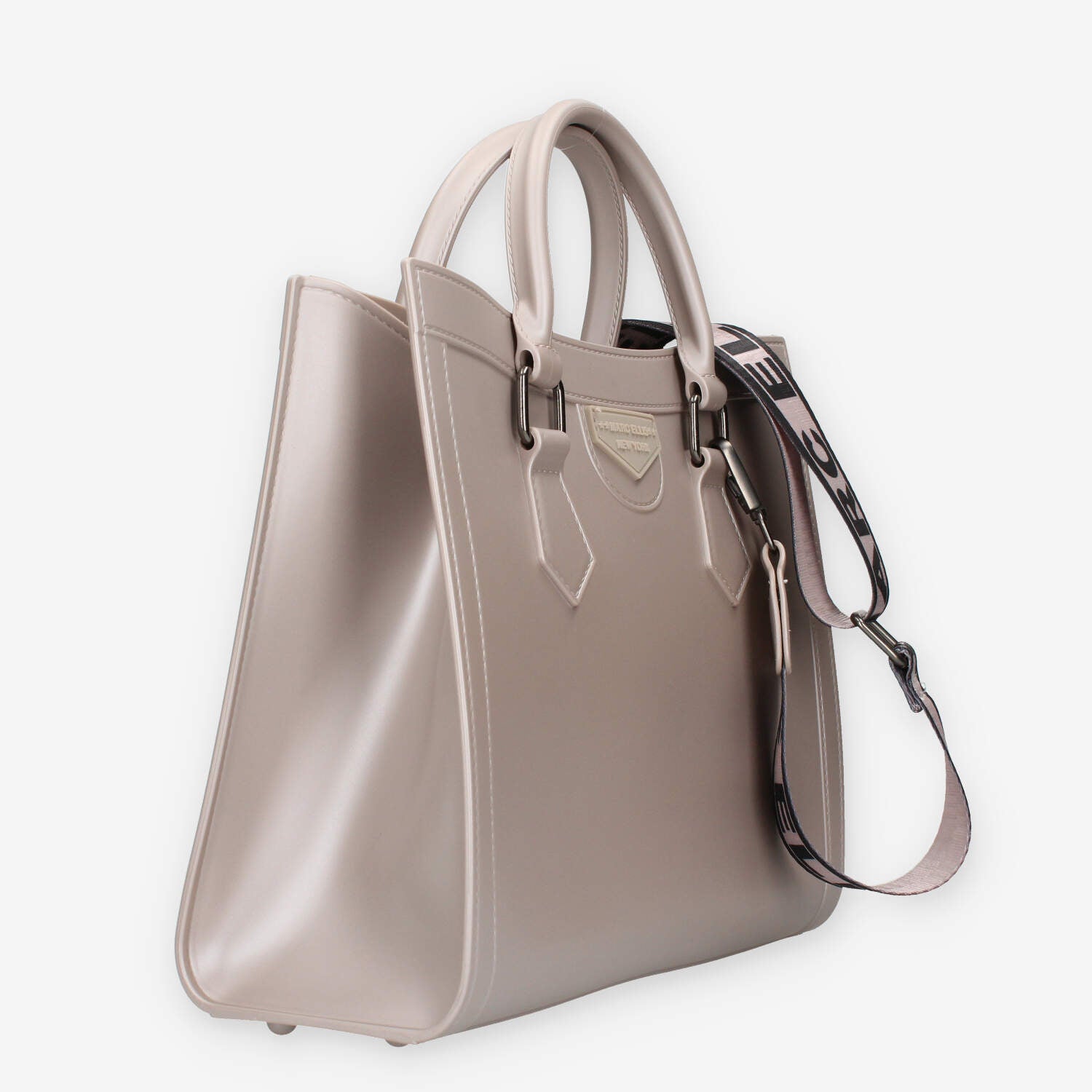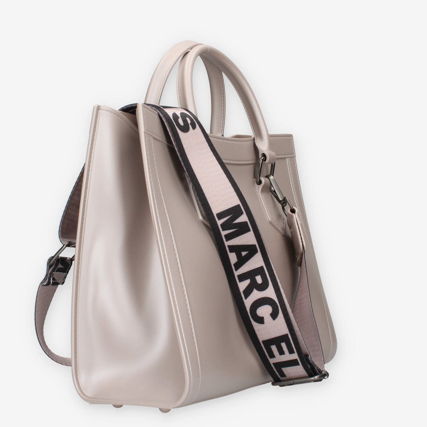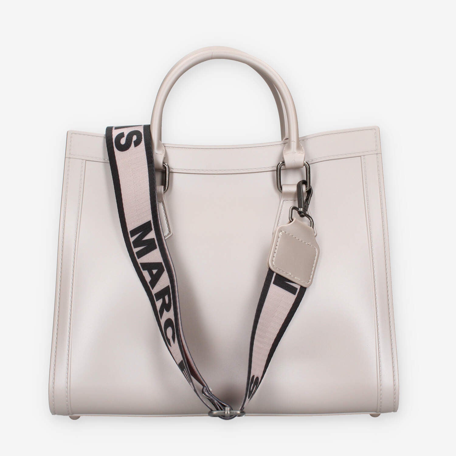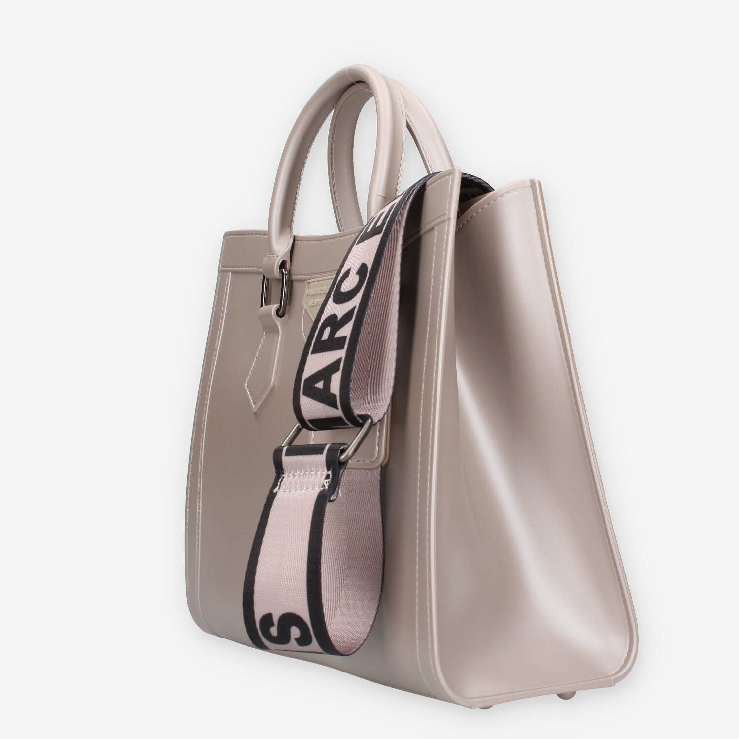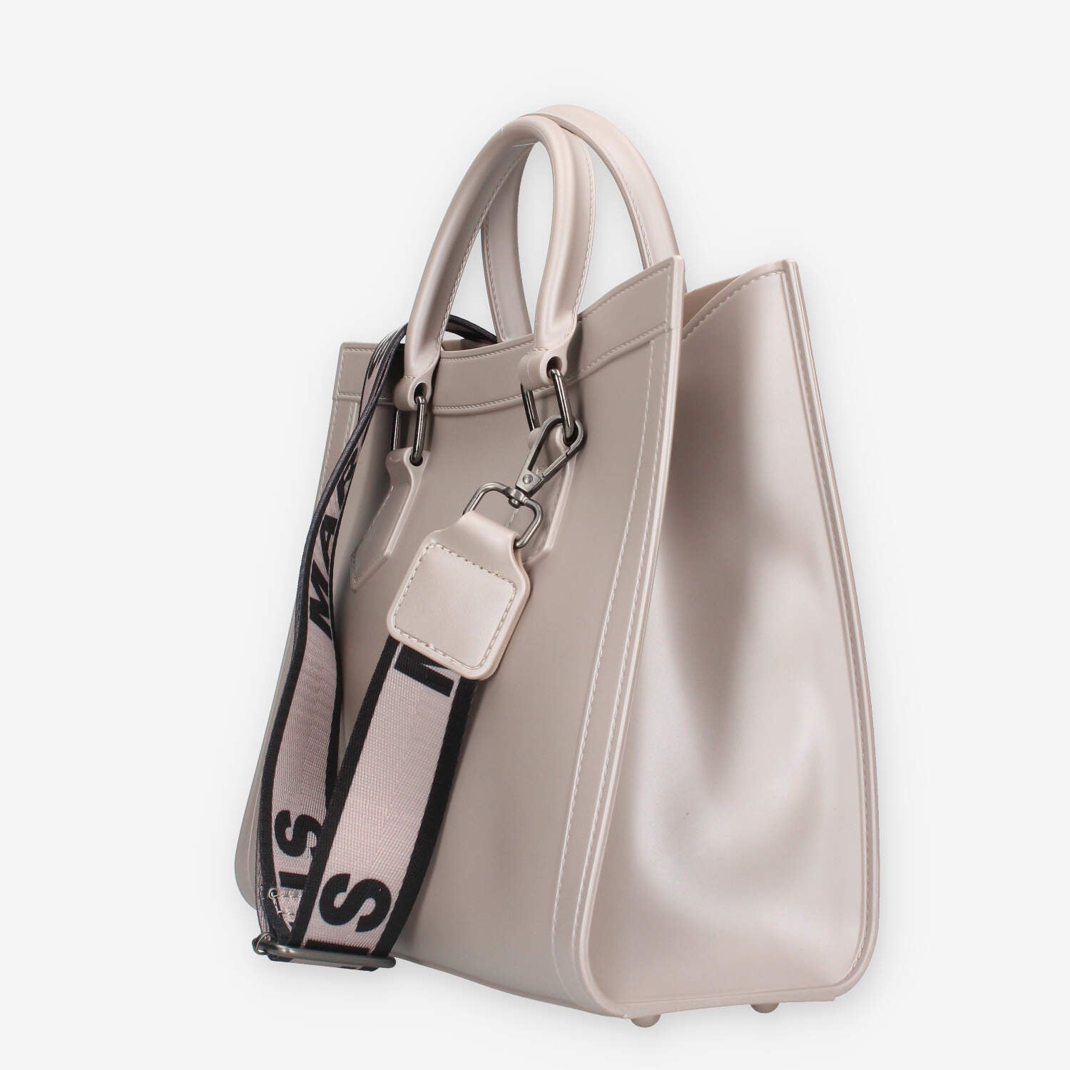 Borsa a mano nera in pvc con metalleria canna di fucile. Patta di chiusura con bottoncino magnetico e tracolla in tessuto logato.