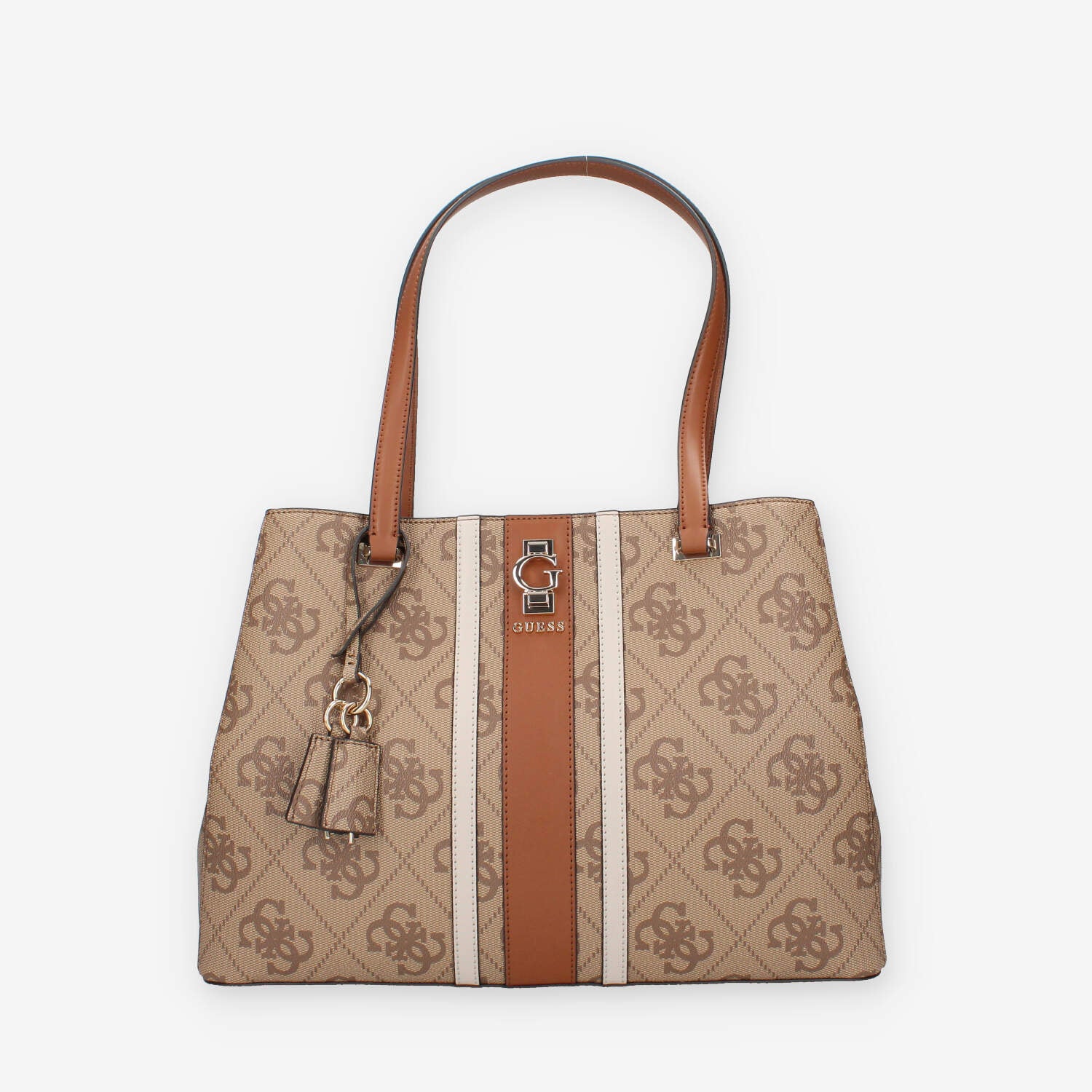 Borsa a spalla beige in ecopelle logata dotata di 3 scomparti 1 dei quali chiuso con zip e 3 tasche interne e 1 esterna.