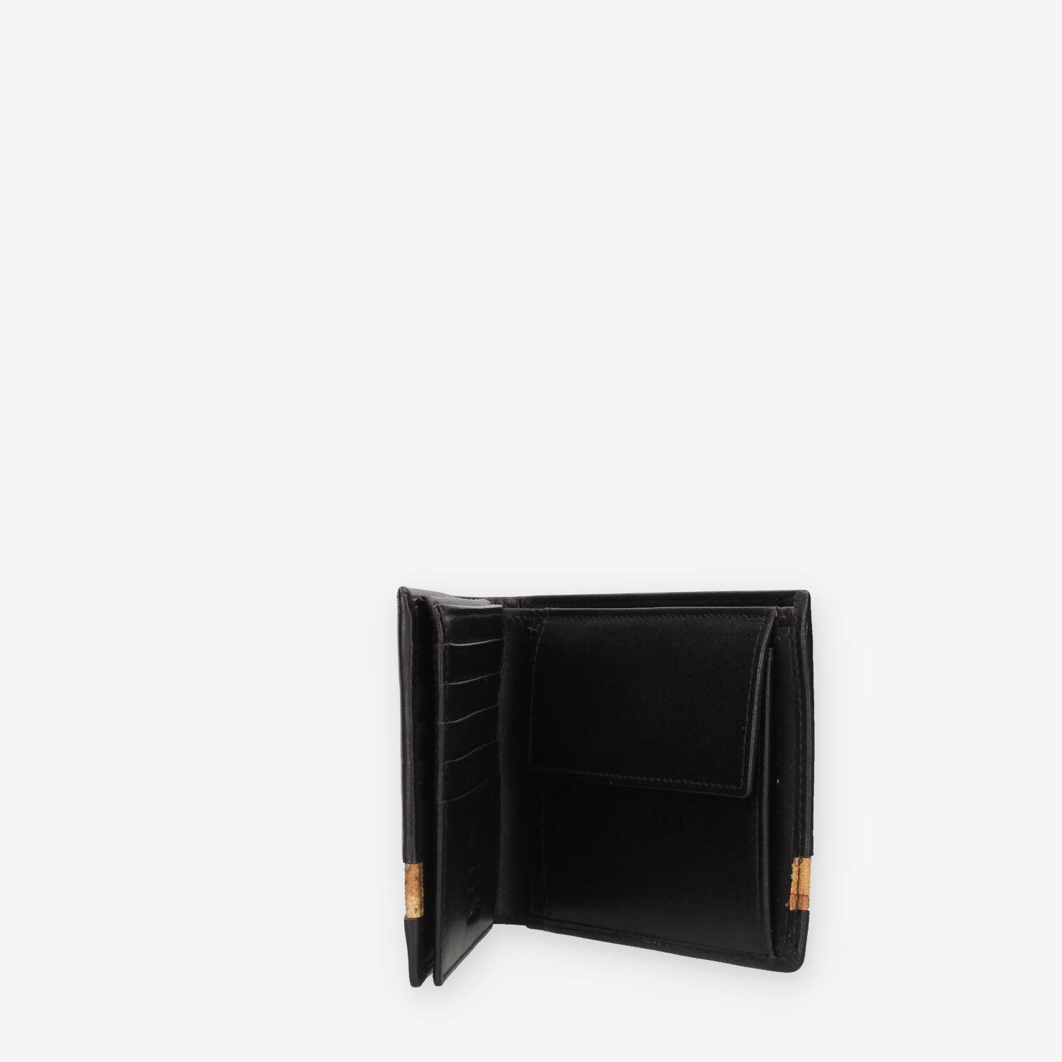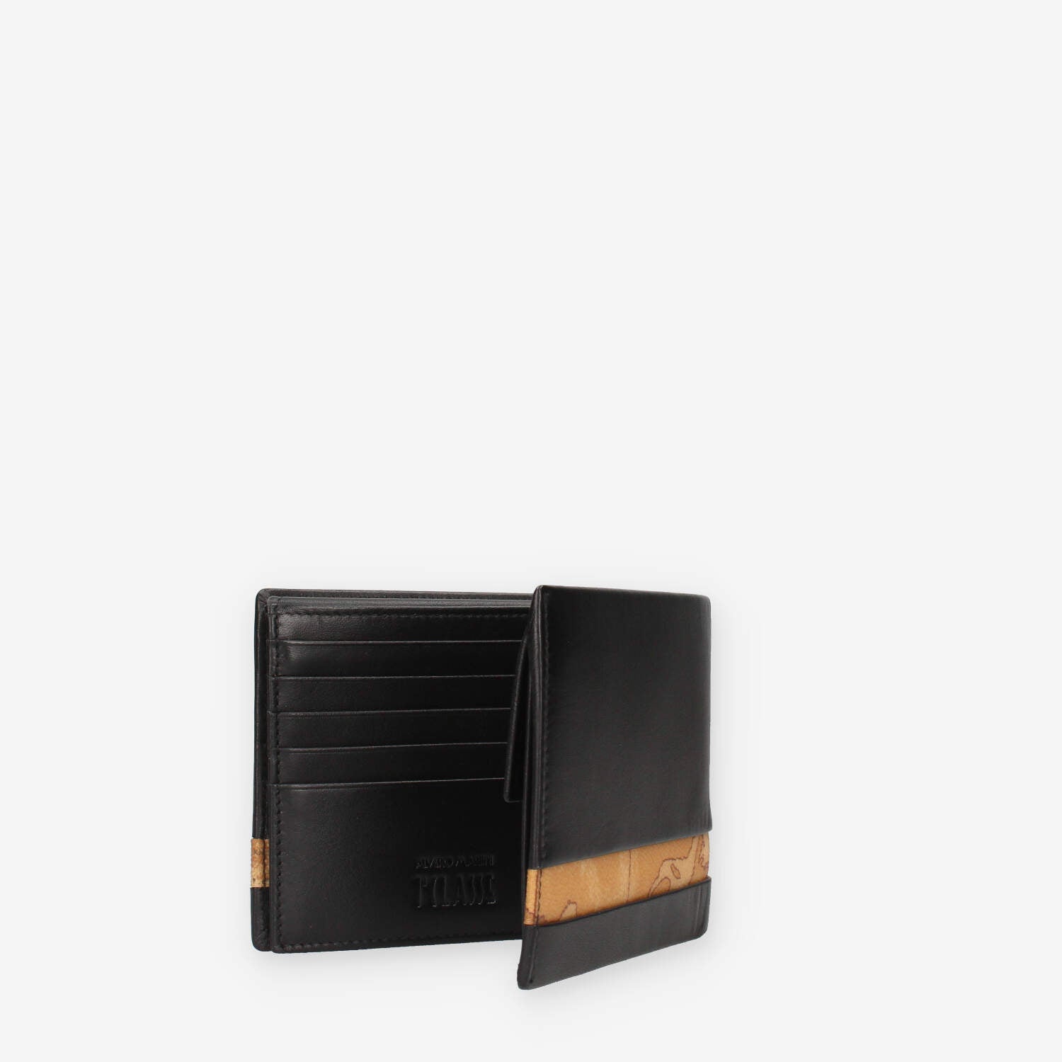Portafogli nero da uomo in vera pelle con inserti in tessuto stampa Geo Classic dotato di 2 sezioni per banconote 10 fessure per carte di credito e una taschina porta spiccioli.