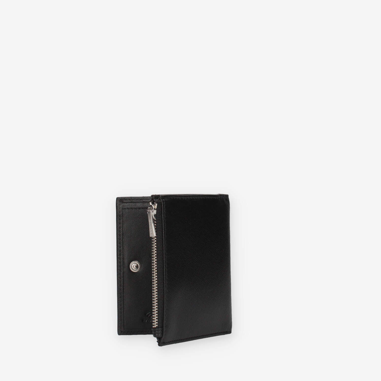 Portafogli nero da uomo in vera pelle dotato di 1 scomparto per banconote, 8 fessure per carte di credito e 1 taschina portaspiccioli laterale. con zip di chiusura.