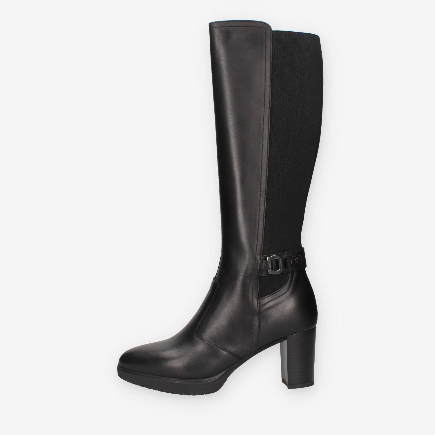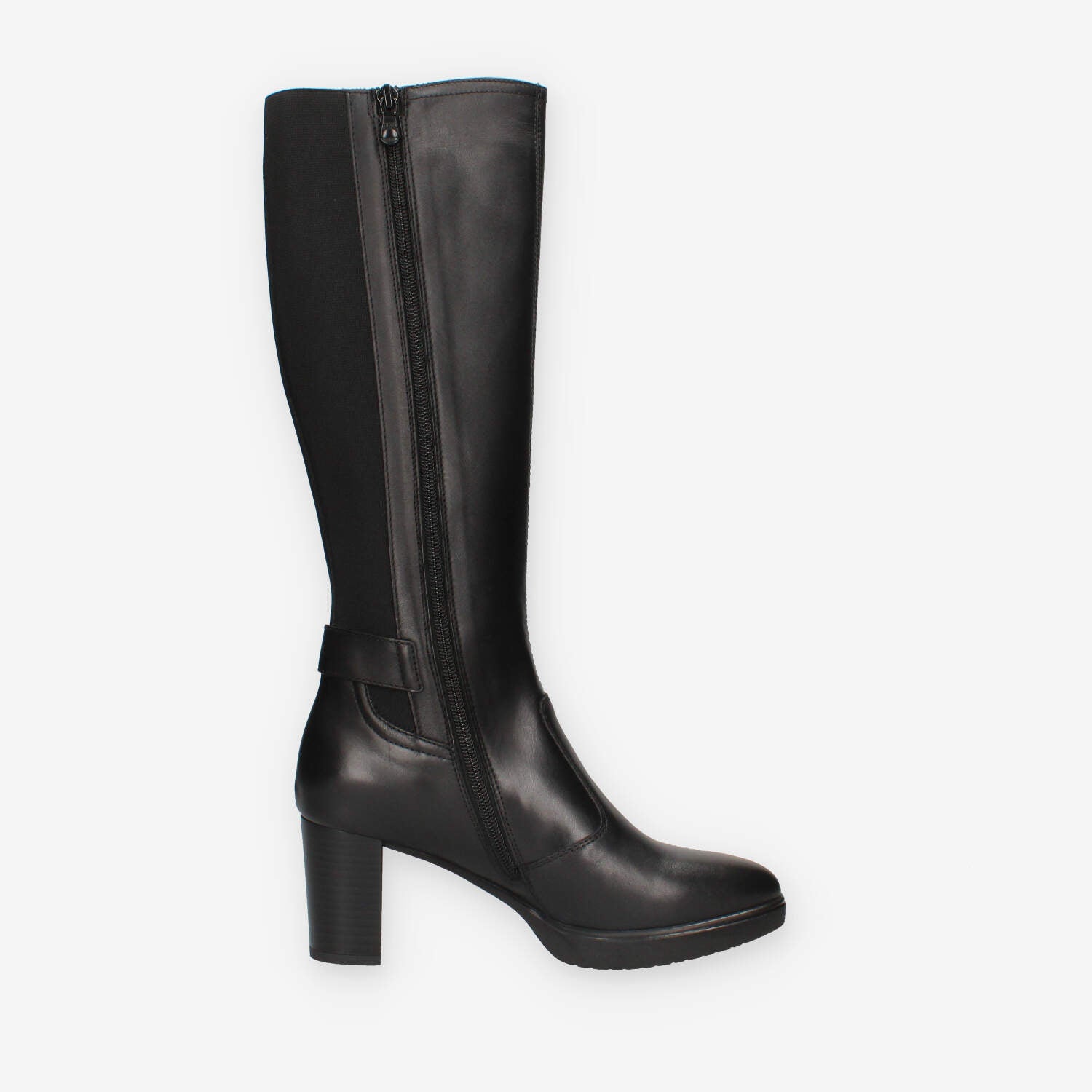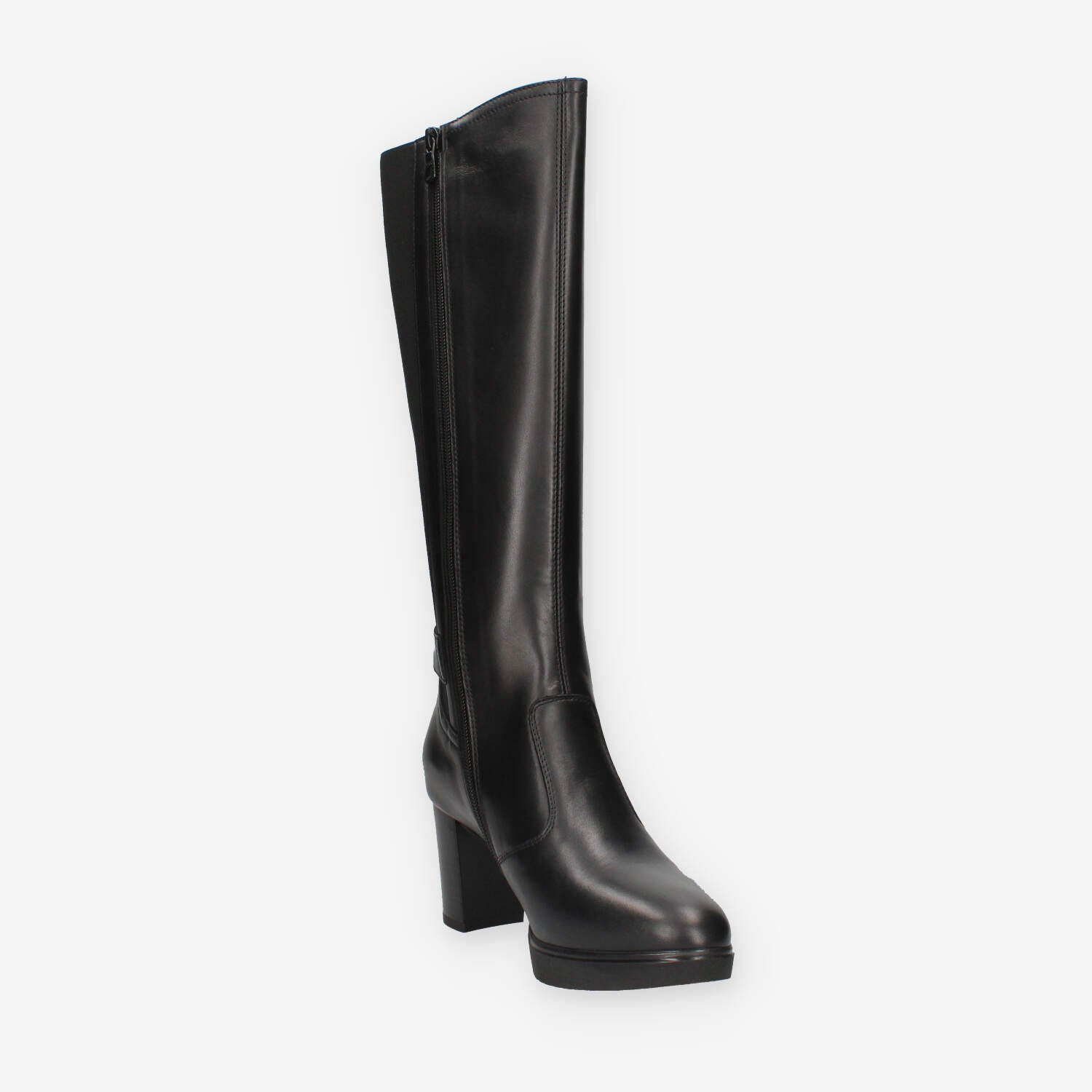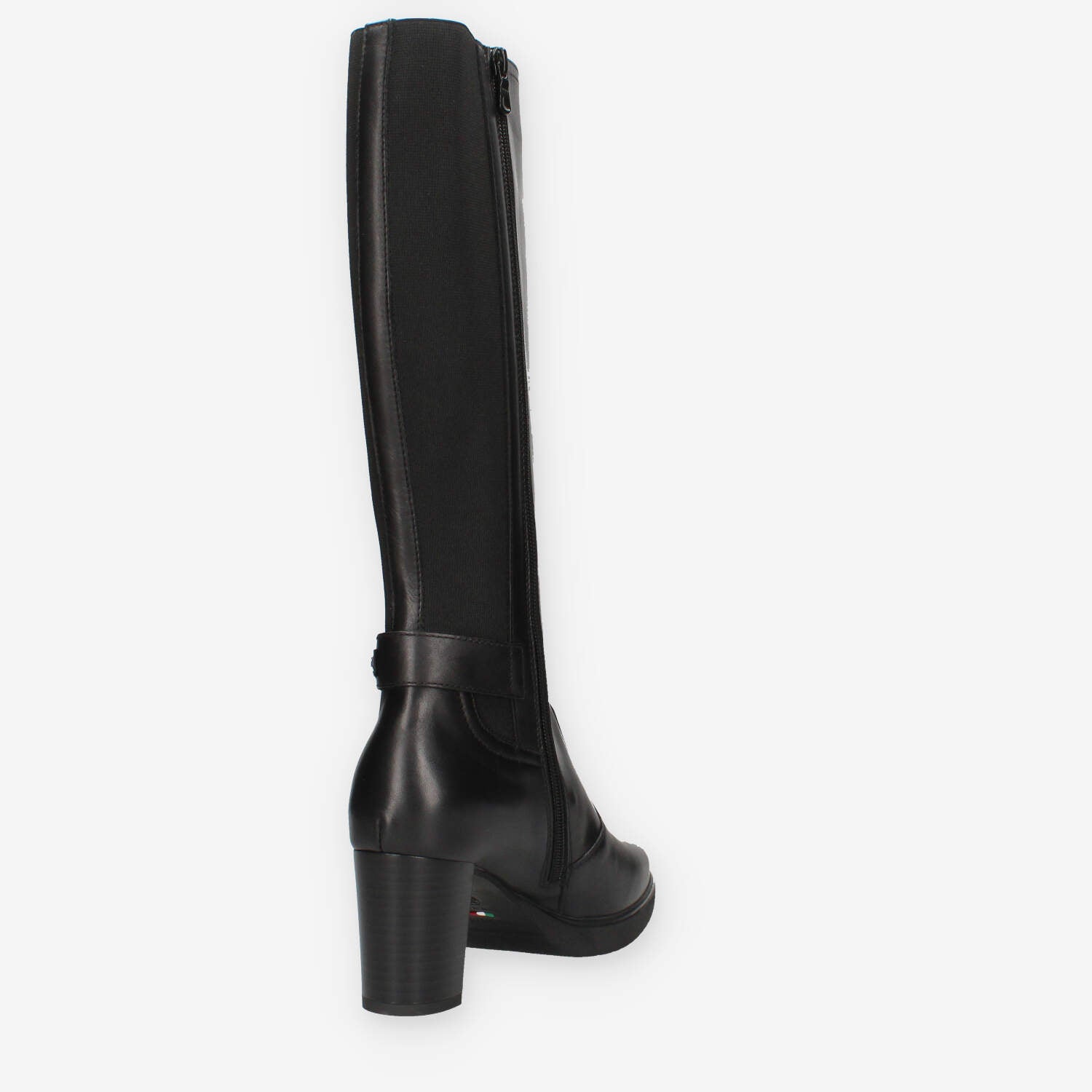 Stivali neri da donna in pelle e tessuto elastico dotati di tacco a blocco alto circa 7 cm.