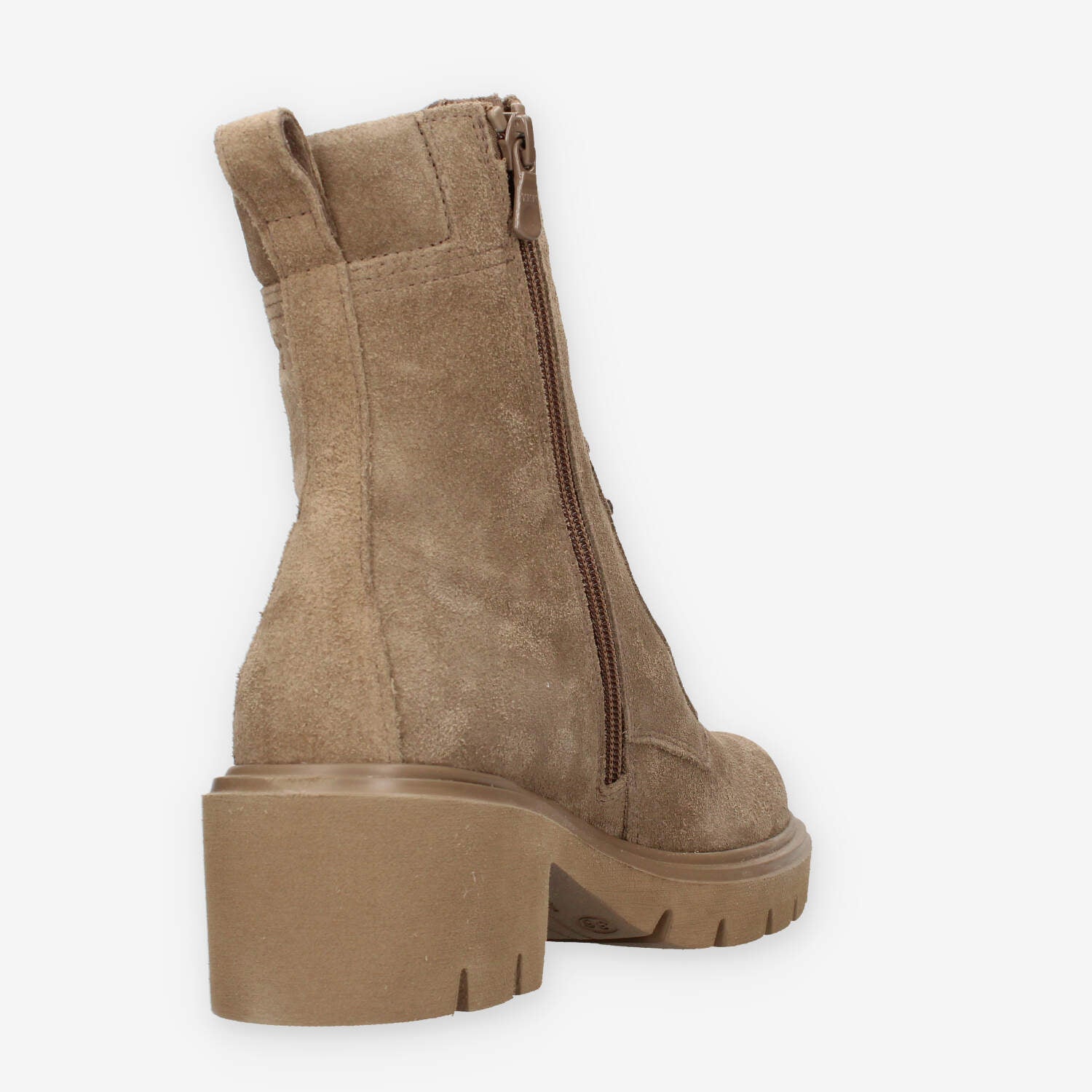 Anfibi tortora da donna in vera pelle scamosciata dotati di lampo di chiusura posta nel lato interno, tacco largo alto circa 5.5 cm e soletta estraibile in poliuretano DRY-GO.