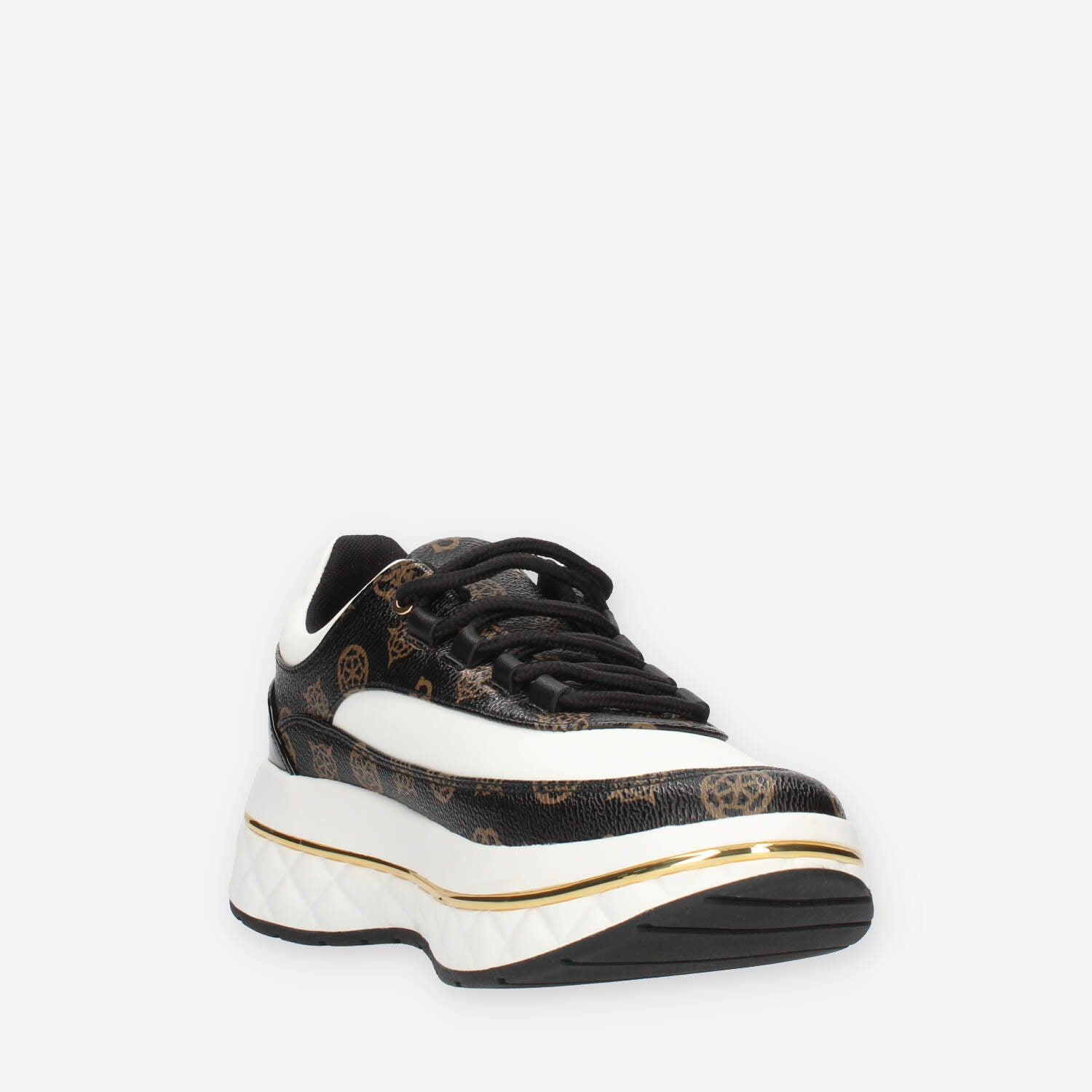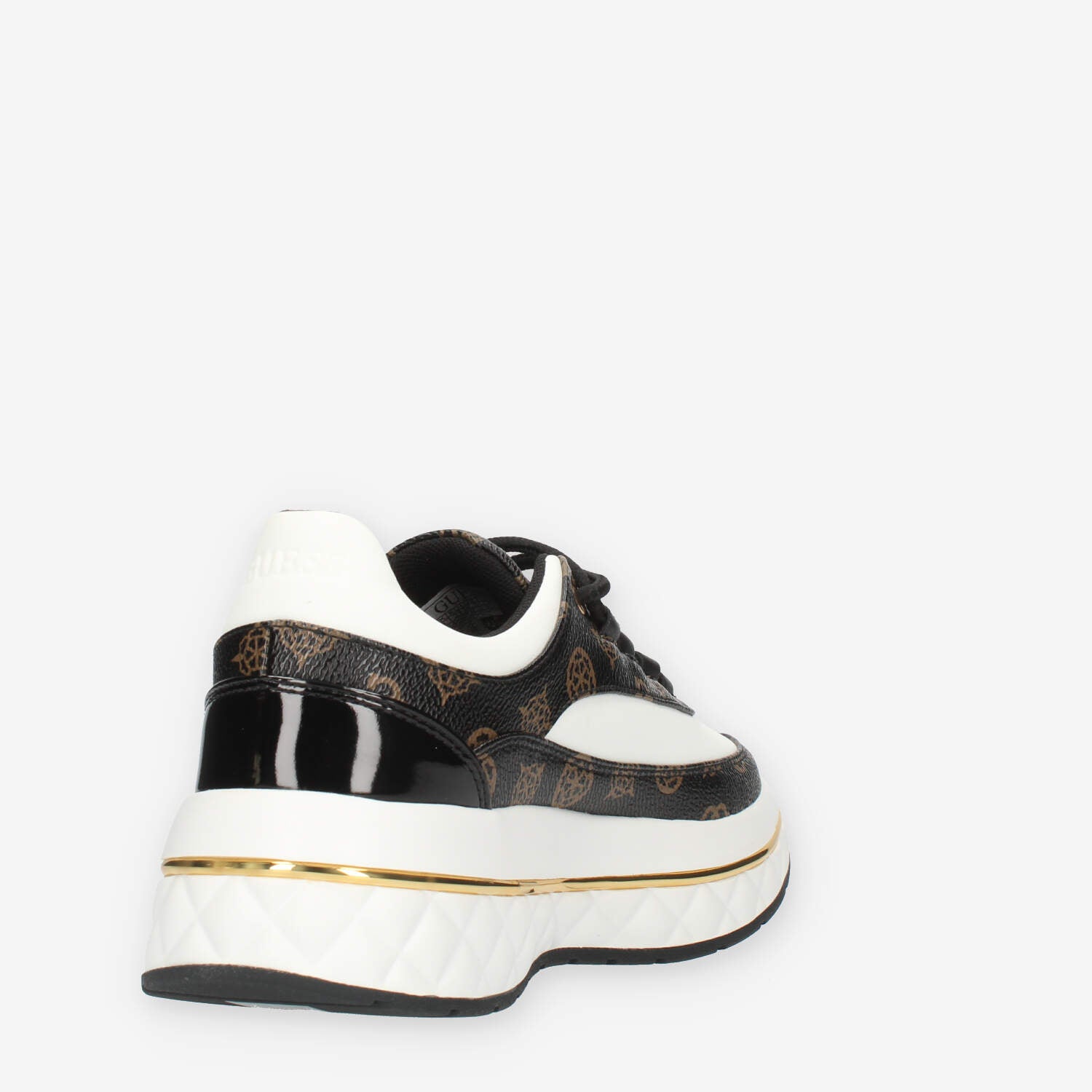 Sneakers bianche e nere logate da donna in ecopelle dotate di sottopiede in tessuto estraibile e fondo in gomma alto circa 5 cm.