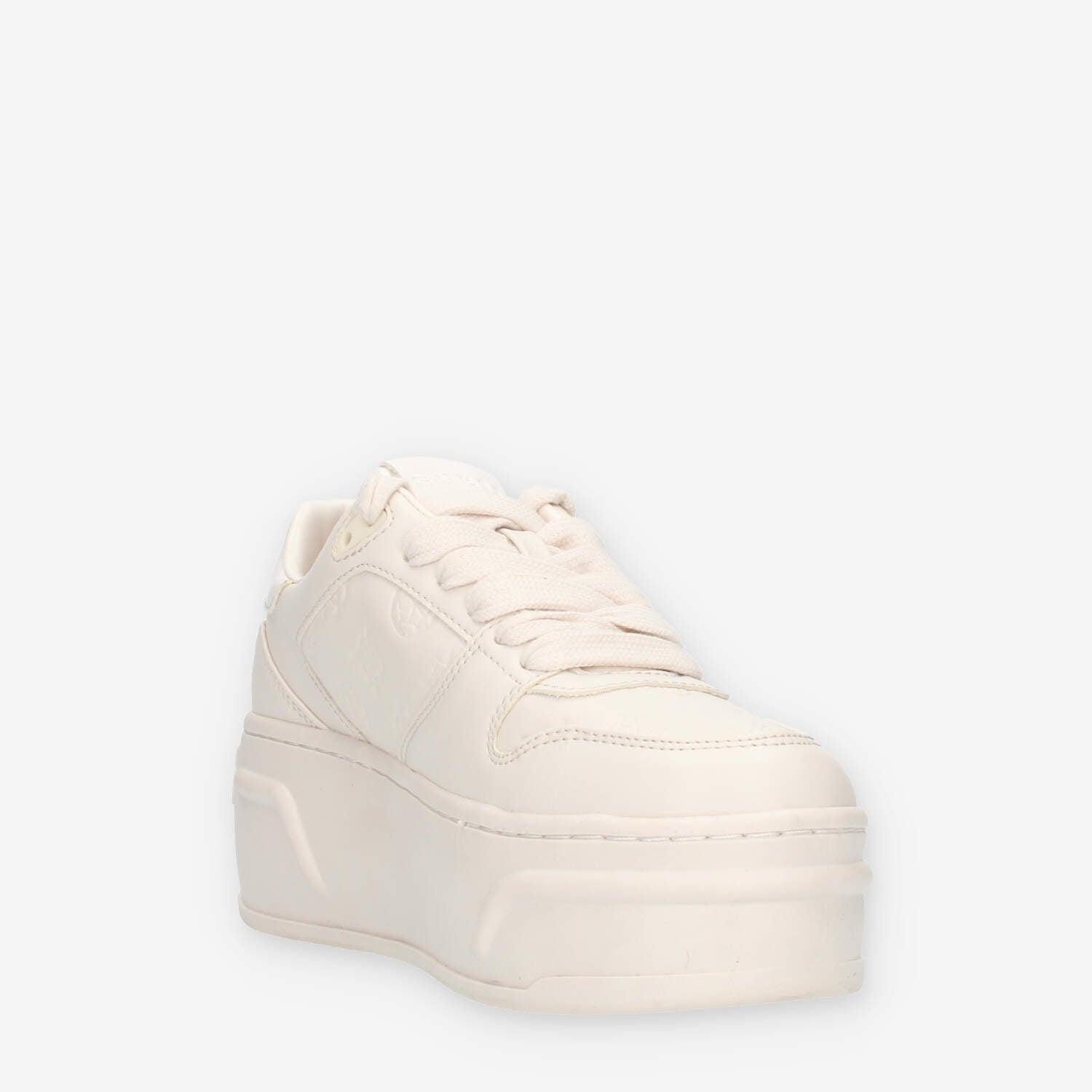 Sneakers panna da donna in ecopelle con loghi. Sottopiede in tessuto estraibile e fondo in gomma alto circa 6.5 cm.