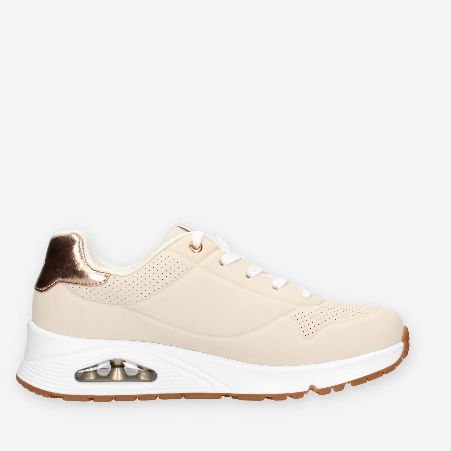 Sneakers beige dalla tomaia in materiale tecnico con finiture metallizzate, una comoda soletta Skechers Air Cooled Memory Foam® e un’intersuola ammortizzata ad aria con tecnologia visibile Skech-Air®.
