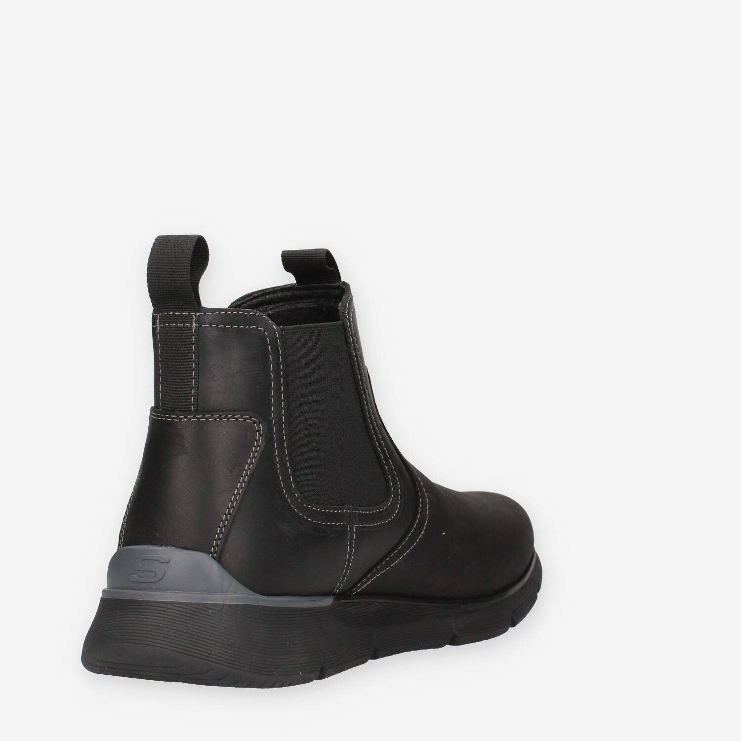 Stivaletti neri da uomo dalla tomaia in pelle con doppio collarino, soletta Skechers Air-Cooled Memory Foam® con filtro in carbone attivo e Skechers Goga Mat Arch™ per un maggiore supporto.