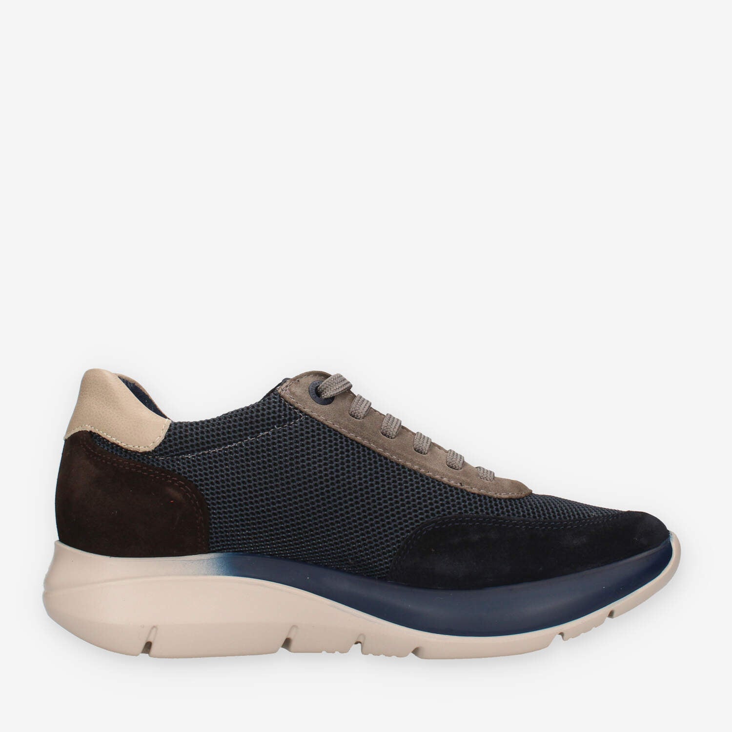Seakers blu da uomo in pelle e tessuto dotate di Tecnologia ADAPTACTION grazie a cui la scarpa si adatta al piede e al suo aumento di larghezza quando si cammina (dai 5mm agli 8mm).