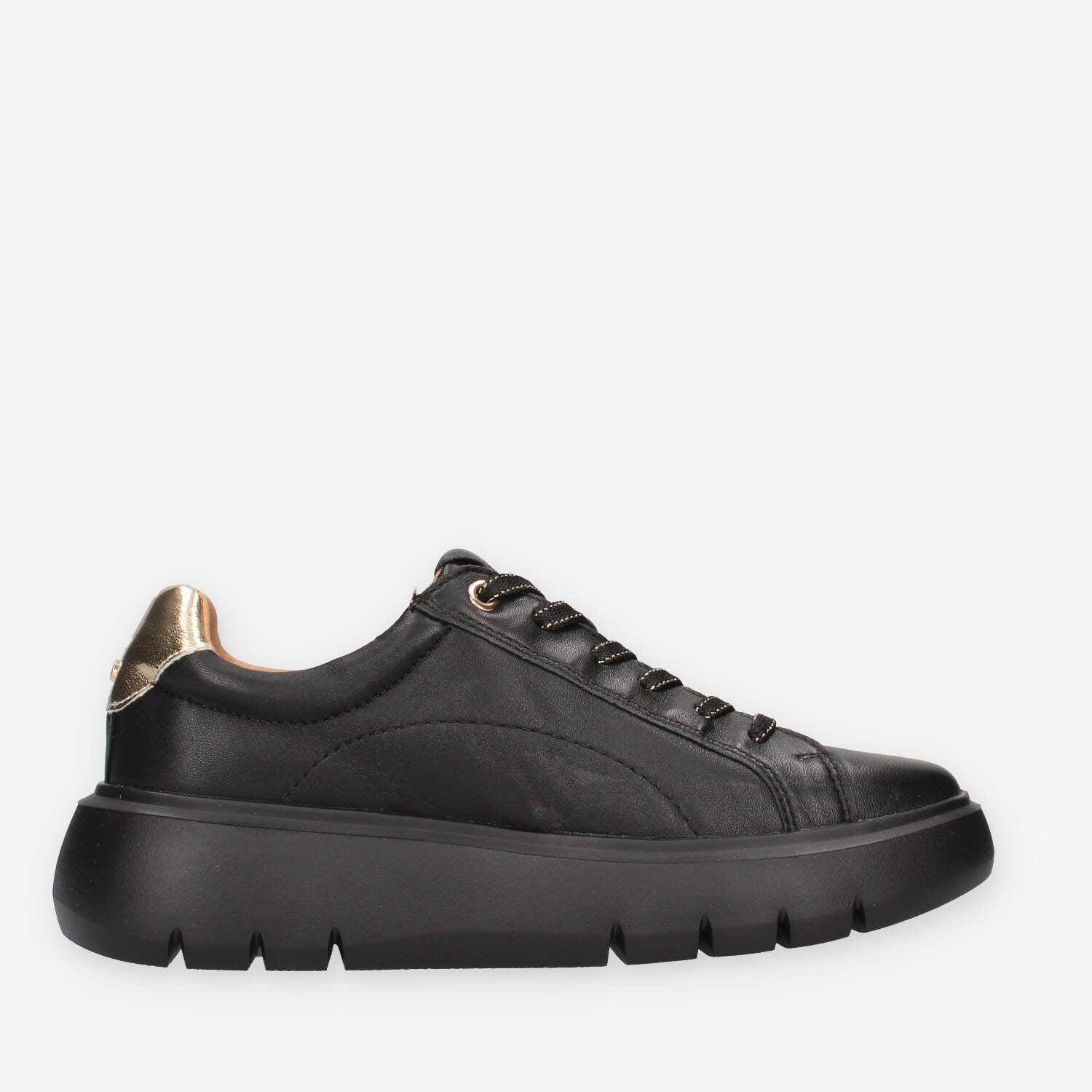Sneakers nere da donna in vera pelle dotate di morbido sottopiede estraibile e fondo in gomma alto circa 4.5 cm.