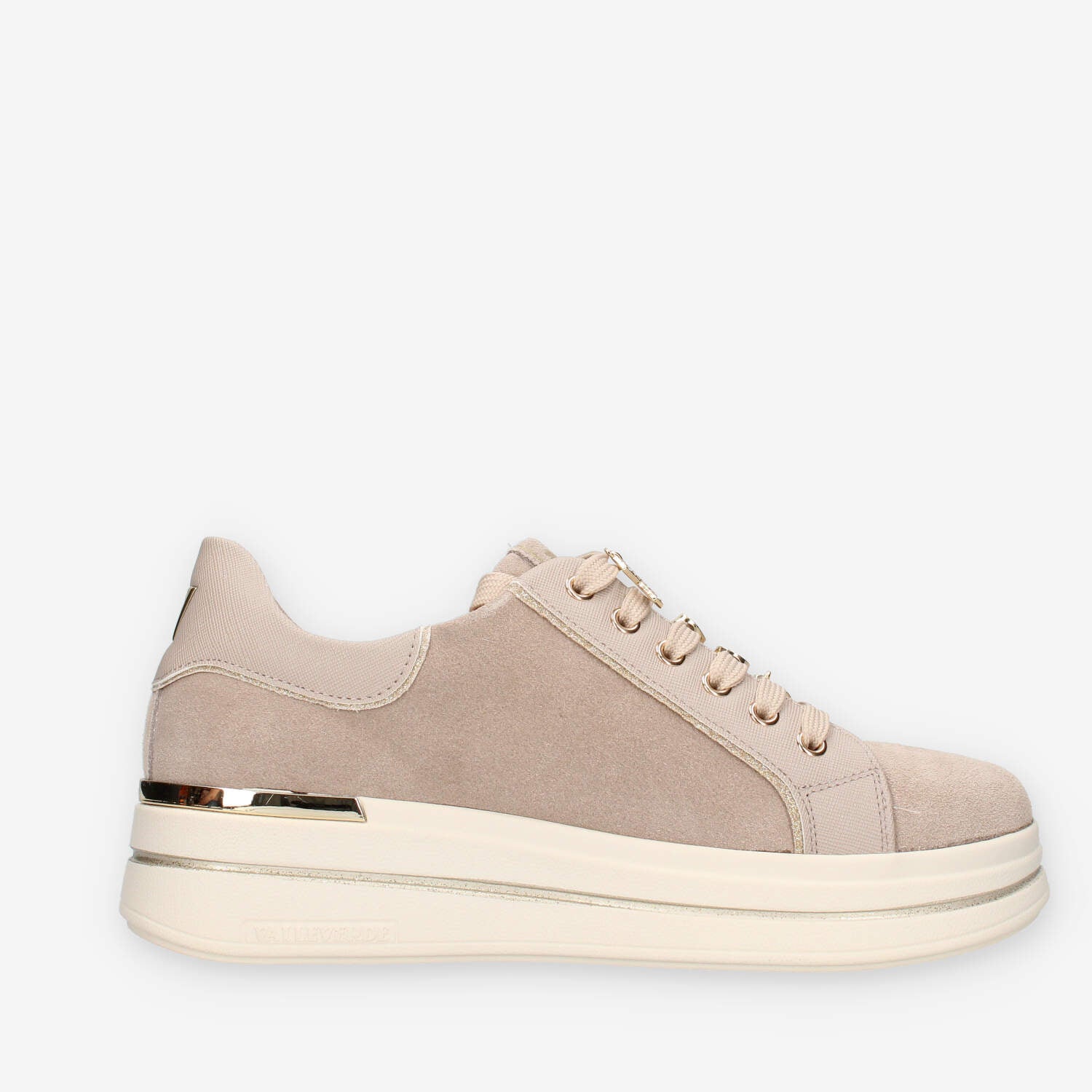 Sneakers beige da donna in ecopelle effetto camoscio dotate di sottopiede in pelle estraibile e fondo in gomma alto circa 5 cm.
